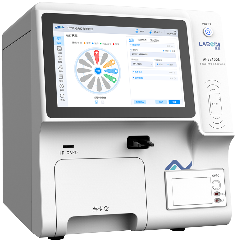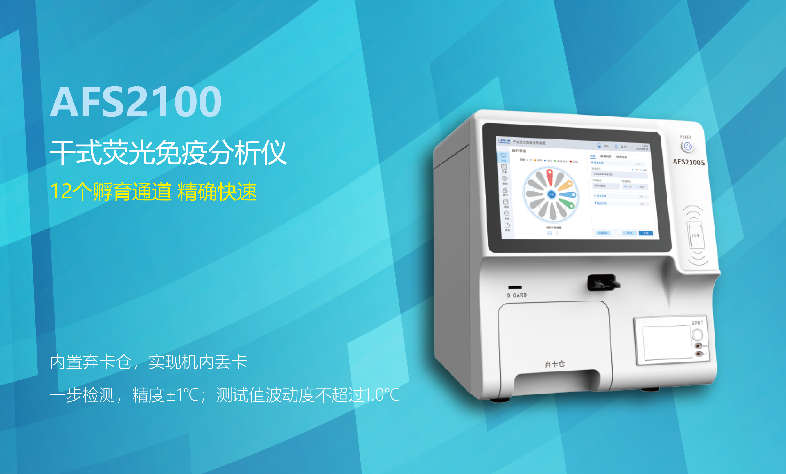 新 的UI构想网页 | 1多个自力孵育区域 | 内装化学试剂卡弃卡仓 | 活跃性感觉到免疫试剂卡拨掉、活跃性丢卡 | 自带热敏彩打机拒绝彩打监测优秀成果